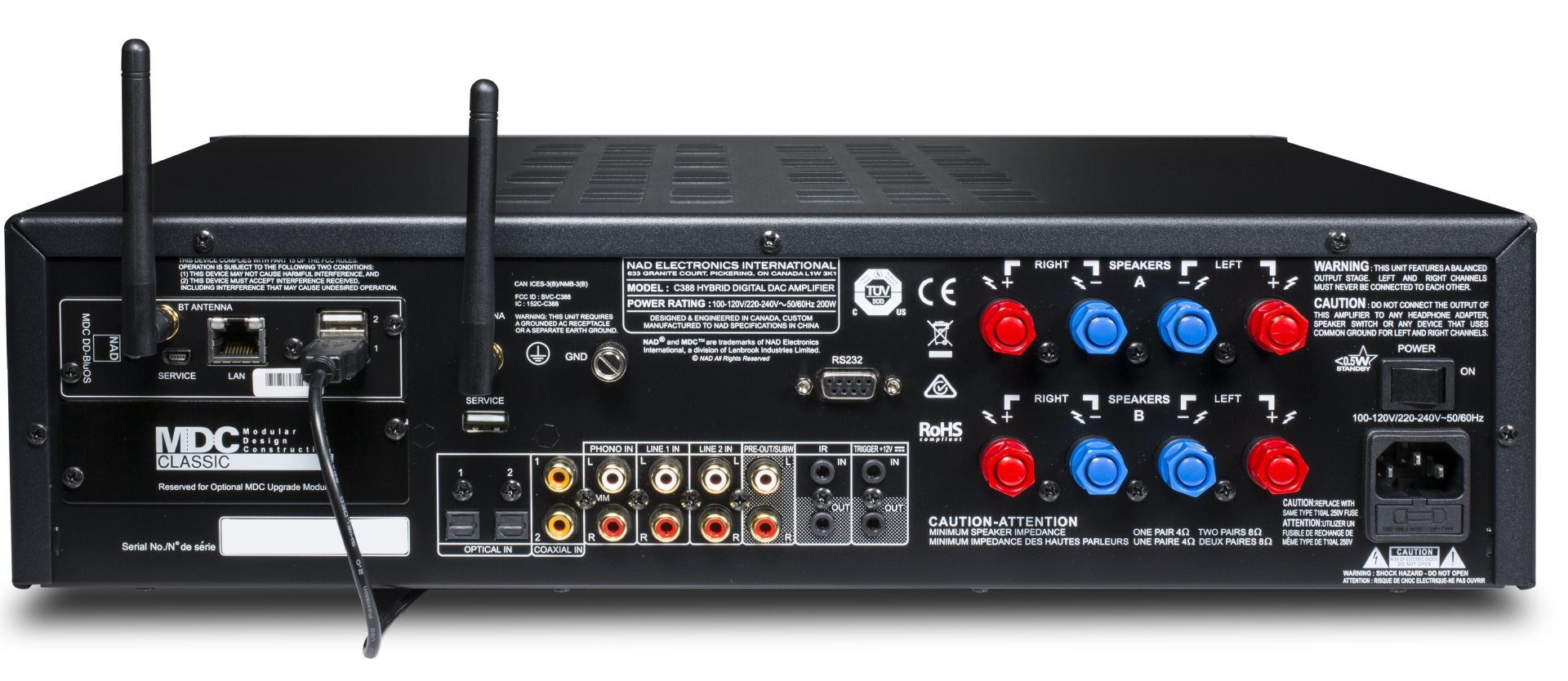 และนอกจากช่องแบบฟิกซ์ที่ติดมาให้นั้น C 388 ยังมีช่อง MDC Upgrade มาให้อีก 2 ช่อง ซึ่งสามารถใช้ MDC Module มาตรฐานของ NAD ที่ออกมาก่อนหน้านี้ได้ เช่น BluOS Module เพื่อเพิ่มขีดความสามารถในการเล่น Network Audio Streaming ได้อีกด้วย (MDC BluOS มีจำหน่ายแยก)