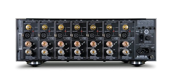 ที่แผงหลังมีช่องเสียบอินพุทให้ทั้งแบบ Single-End RCA และ Balanced XLR อย่างละ 7 ชุด พร้อมสวิทช์เลือกการทำงานของแต่ละอินพุทกำกับเอาไว้พร้อมสรรพ