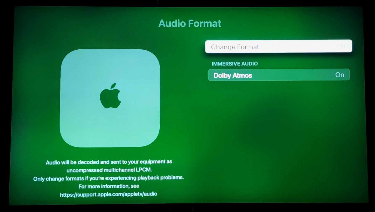 เกริ่นมานาน มาเข้าเรื่องวิธีการฟังเพลงแบบอิมเมอร์ซีฟซาวน์กันดีกว่า อันดับแรกคุณต้องเป็นสมาชิกของ Apple music เสียก่อน อันต่อมาคุณต้องมีกล่อง AppleTV เสียก่อนใครยังไม่มีแนะนำ กล่อง AppleTV 4 K รุ่นล่าสุดไปเลยครับ ชุดท้ายชุดโอมเธียเตอร์ที่เราใช้ดูหนังกันนี่แหล่ะครับ แต่มีข้อแม้ว่าระบบของท่านต้องรองรับการถอดรหัส Dolby Atmos แล้ว ครบสามอย่างก็ลุยกันได้เลย ใครที่ใช้กล่อง AppleTV ดูหนังอยู่แล้วสบายเลยครับ แค่สมัคร Apple Music เพิ่ม ก็ใช้งานได้เลย อันดับแรกเข้าไปดูที่เมนู Setting ของกล่อง AppleTV ว่าในส่วนเมนู Audio Format นั้นได้ On ตัว Dolby Atmos ไว้แล้วหรือยัง ถ้ายัง Off อยู่ ก็แค่ ON เท่านั้นเองครับ