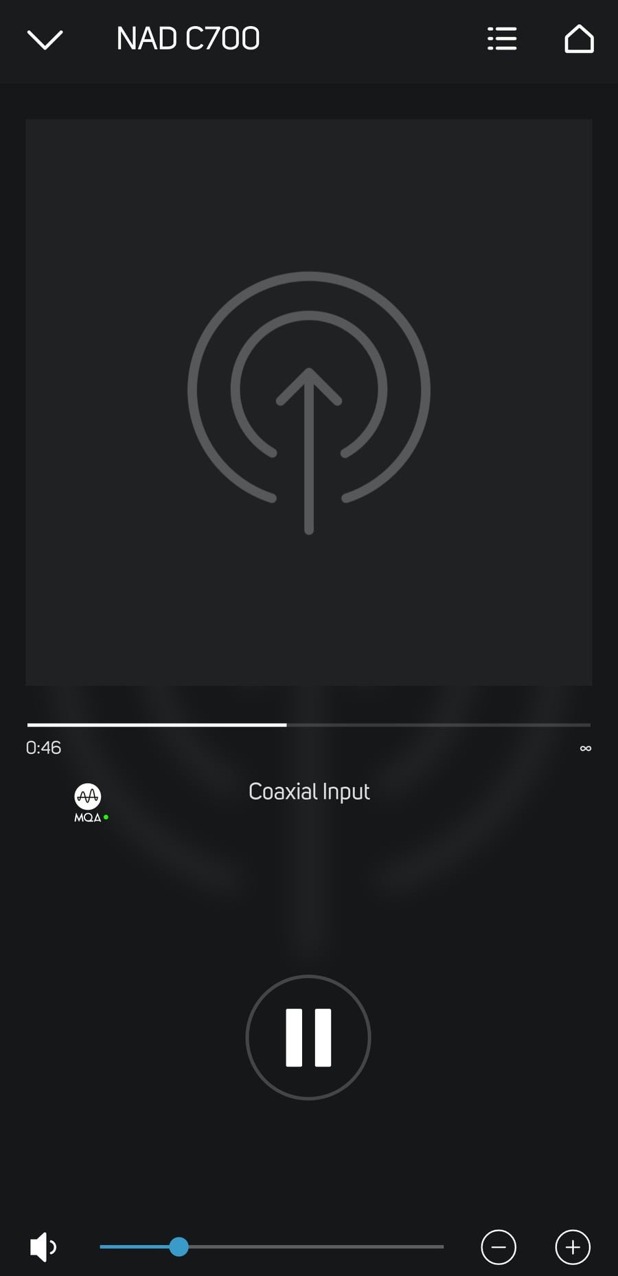 เวลาเล่นก็เลือก source ที่เมนูแท็ปด้านซ้ายเป็นอินพุทโคแอ็กเชียล ท่านก็จะได้ฟินกับ การแผ่น MQA-CD เสียทีครับ สังเกตที่ตัวแอป จะมีโลโก้ MQA แสดงขึ้นมาเท่ห์ๆเลย พร้อมกับคุณภาพเสียงที่ถูกยกมาอีกระดับ เมื่อเทียบกับการฟังจาก แผ่นซีดีธรรมดาทั่วๆไป ส่วนใครที่ใช้ NAD D3045 นั้น โลโก้ MQA จะขึ้นโชว์ที่หน้าปัทม์ตัวเครื่องเลย เมื่อเวลาที่ท่านเลือก source เป็นช่องโคแอ็กเชียลเหมือนกัน